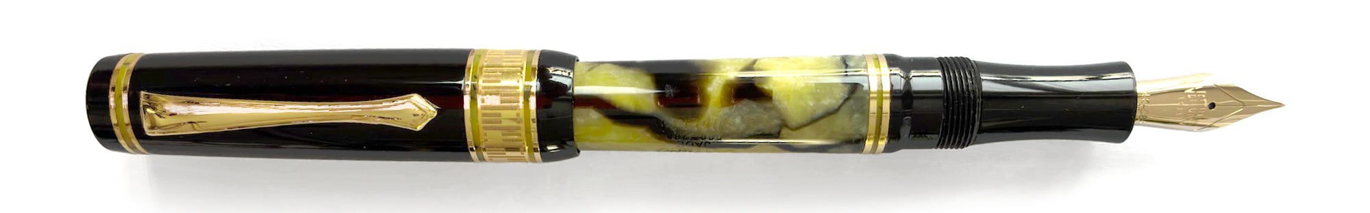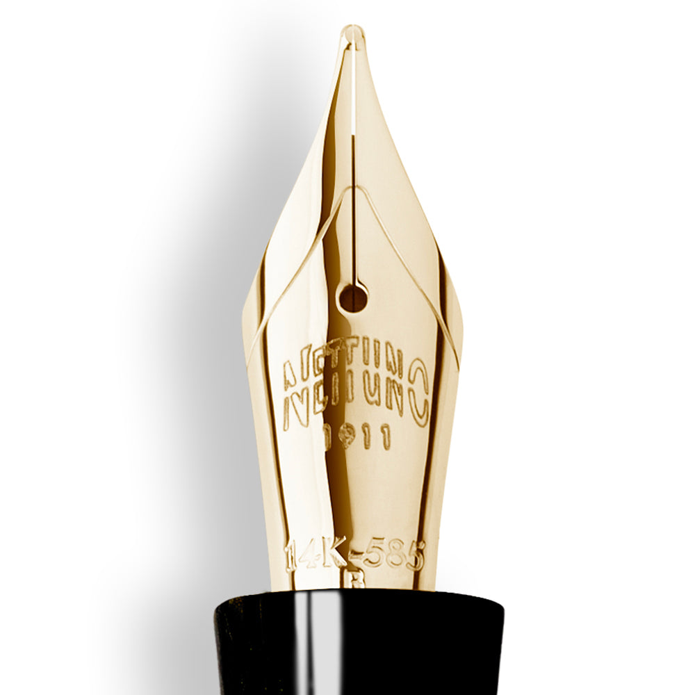 Il pennino è disponibile in due versioni: oro 14 carati o acciaio dorato, entrambi disponibili in diverse misure (EF, F, M, B, Stub) per adattarsi a ogni stile di scrittura. La finitura del pennino riprende l'eleganza delle finiture dorate del corpo, creando un'armonia estetica perfetta. Il sistema di alimentazione è stato ottimizzato per garantire un flusso d'inchiostro costante e uniforme, caratteristica fondamentale per chi utilizza quotidianamente una stilografica in celluloide di questo livello.