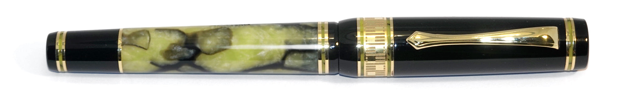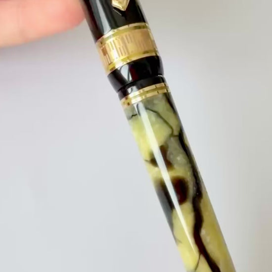 Realizzata in celluloide verde giada con venature nere, questa stilografica in celluloide offre una profondità visiva unica. La celluloide opalescente cattura e riflette la luce in modo straordinario, creando giochi cromatici che rendono ogni esemplare unico. Il corpo e il cappuccio in resina italiana nero profondo creano un contrasto elegante con le finiture dorate, mentre il sistema di caricamento a stantuffo garantisce un'autonomia eccezionale.